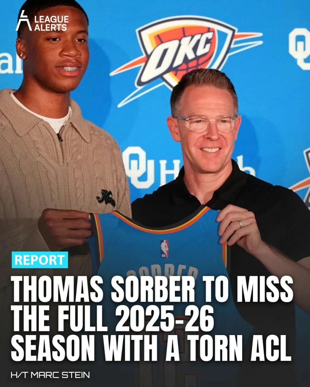NBA传来令人惋惜的消息。据知名记者Michael Scotto报道,雷霆队今年首轮15顺位新秀托马斯·索伯在训练中遭遇右膝前十字韧带撕裂(ACL撕裂),将缺席2024-25赛季的所有比赛。
